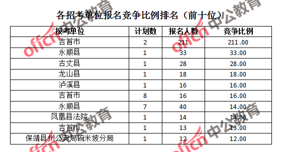 競(jìng)爭(zhēng)熱門(mén)招考單位,前三位依次是:吉首市(競(jìng)爭(zhēng)比例211:1)、永順縣(競(jìng)爭(zhēng)比例33:1)和古丈縣(競(jìng)爭(zhēng)比例28:1)。