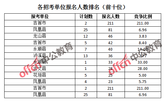 為幫助廣大考生更清晰的了解報(bào)名情況,中公教育整理了湘西市各招考單位的報(bào)名人數(shù)排名以及競(jìng)爭(zhēng)比例排名,供廣大考生參考: