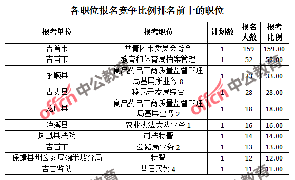 競(jìng)爭(zhēng)熱門(mén)職位,前三位依次是:吉首市共青團(tuán)市委員會(huì)綜合(競(jìng)爭(zhēng)比例159:1)、吉首市教育和體育局檔案管理(競(jìng)爭(zhēng)比例52:1)和永順縣食品藥品工商質(zhì)量監(jiān)督管理局基層所業(yè)務(wù)8(競(jìng)爭(zhēng)比例33:1)。