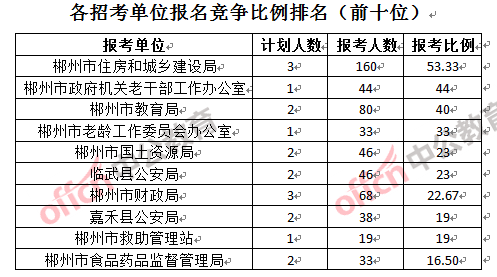競(jìng)爭(zhēng)熱門招考單位,前三位依次是:郴州市住房和城鄉(xiāng)建設(shè)局(競(jìng)爭(zhēng)比例53.33:1)、郴州市政府機(jī)關(guān)老干部工作辦公室(競(jìng)爭(zhēng)比例44:1)和郴州市教育局(競(jìng)爭(zhēng)比例40:1)。
