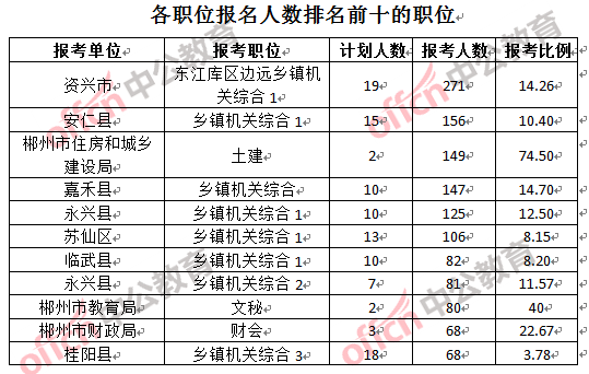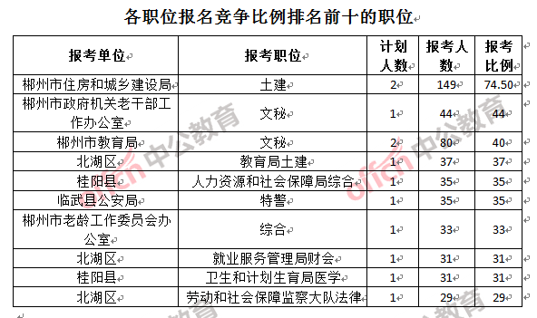 競(jìng)爭(zhēng)最熱門職位,前三位依次是:郴州市住房和城鄉(xiāng)建設(shè)局土建(競(jìng)爭(zhēng)比例74.5:1)、郴州市政府機(jī)關(guān)老干部工作辦公室文秘(競(jìng)爭(zhēng)比例44:1)和郴州市教育局文秘(競(jìng)爭(zhēng)比例40:1)。