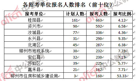 為幫助廣大考生更清晰的了解報(bào)名情況,中公教育整理了郴州市各招考單位的報(bào)名人數(shù)排名以及競(jìng)爭(zhēng)比例排名,供廣大考生參考: