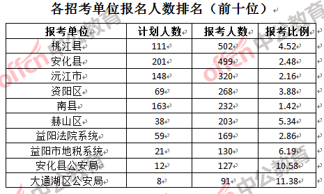 為幫助廣大考生更清晰的了解報名情況,中公教育整理了益陽市各招考單位的報名人數(shù)排名以及競爭比例排名,供廣大考生參考: