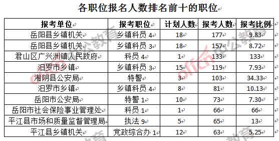 為幫助廣大考生更清晰的了解報名情況,中公教育整理了岳陽市各職位的報名人數(shù)排名以及競爭比例排名,供廣大考生參考: