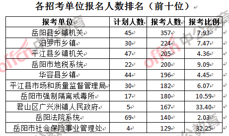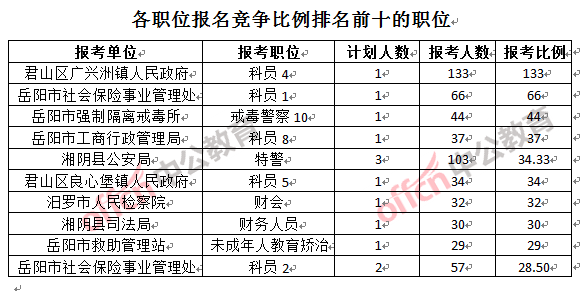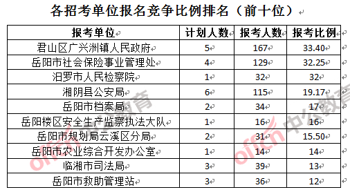 競爭熱門招考單位,前三位依次是:君山區(qū)廣興洲鎮(zhèn)人民政府(競爭比例33.4:1)、岳陽市社會保險事業(yè)管理處(競爭比例32.25:1)和汨羅市人民檢察院(競爭比例32:1)。