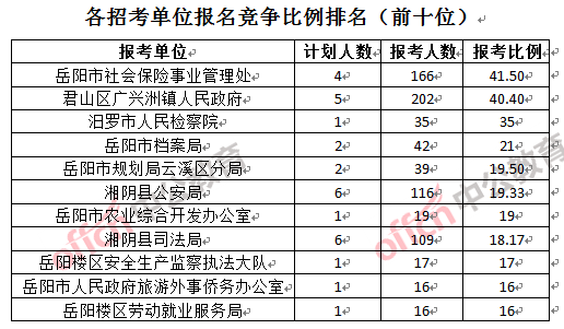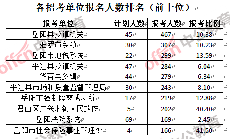 為幫助廣大考生更清晰的了解報(bào)名情況,中公網(wǎng)校整理了岳陽(yáng)市各招考單位的報(bào)名人數(shù)排名以及競(jìng)爭(zhēng)比例排名,供廣大考生參考: