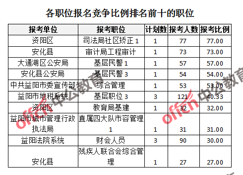 為幫助廣大考生更清晰的了解報名情況,中公網(wǎng)校整理了益陽市各職位的報名人數(shù)排名以及競爭比例排名,供廣大考生參考: