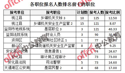 競爭熱門職位,前三位依次是:資陽區(qū)司法局社區(qū)矯正1(競爭比例77:1)、安化縣審計局工程審計(競爭比例73:1)、大通湖區(qū)公安局基層民警1(競爭比例57:1)。