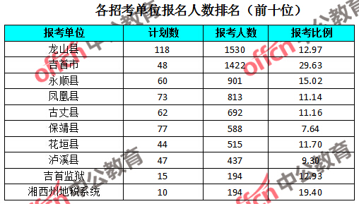 為幫助廣大考生更清晰的了解報(bào)名情況,中公網(wǎng)校整理了湖南湘西各招考單位的報(bào)名人數(shù)排名以及競爭比例排名,供廣大考生參考: