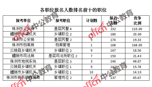 為幫助廣大考生更清晰的了解報(bào)名情況,中公網(wǎng)校整理了株洲市各職位的報(bào)名人數(shù)排名以及競(jìng)爭(zhēng)比例排名,供廣大考生參考:
