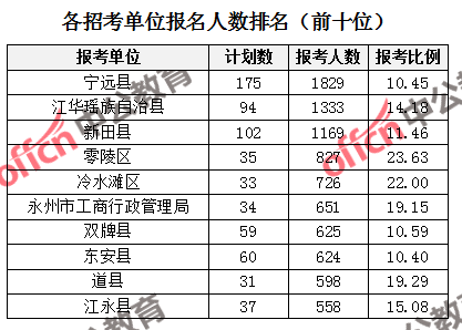 為幫助廣大考生更清晰的了解報名情況,中公網(wǎng)校整理了永州市各招考單位的報名人數(shù)排名以及競爭比例排名,供廣大考生參考: