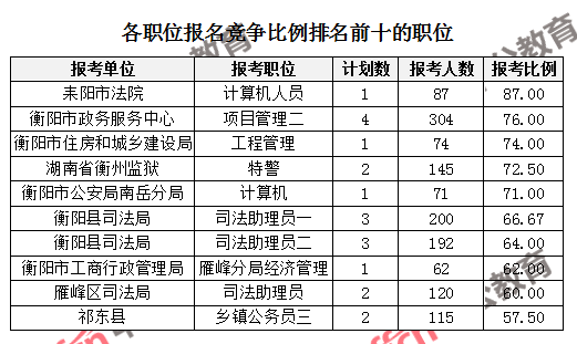 競爭熱門職位,前三位依次是:耒陽市法院計算機(jī)人員(競爭比例87:1)、衡陽市政務(wù)服務(wù)中心項目管理二(競爭比例76:1)、衡陽市住房和城鄉(xiāng)建設(shè)局工程管理(競爭比例74:1)。
