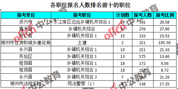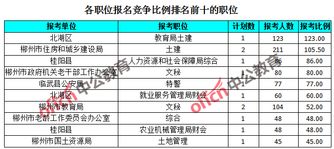 為幫助廣大考生更清晰的了解報名情況,中公網(wǎng)校整理了湖南郴州各職位的報名人數(shù)排名以及競爭比例排名,供廣大考生參考: