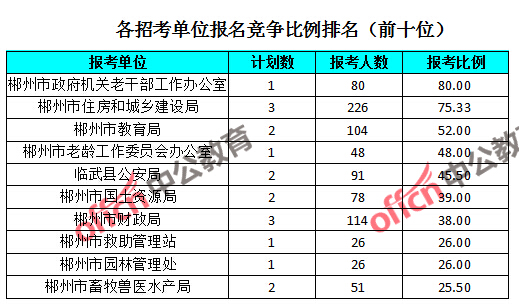 競爭熱門招考單位,前三位依次是:郴州市政府機關(guān)老干部工作辦公室(競爭比例80:1)、郴州市住房和城鄉(xiāng)建設局(競爭比例75.33:1)和郴州市教育局(競爭比例52:1)。