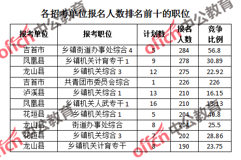 為幫助廣大考生更清晰的了解報名情況,中公網(wǎng)校整理了湘西州各職位的報名人數(shù)排名以及競爭比例排名,供廣大考生參考: