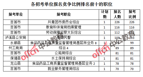 競爭熱門職位,前三位依次是:吉首市共青團(tuán)市委員會綜合(競爭比例226:1)、吉首市教育和體育局檔案管理(競爭比例116:1)和吉首市勞動監(jiān)察大隊綜合(競爭比例112:1)。