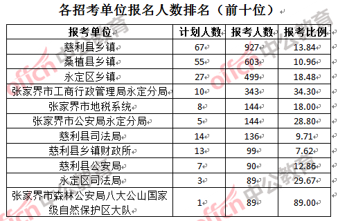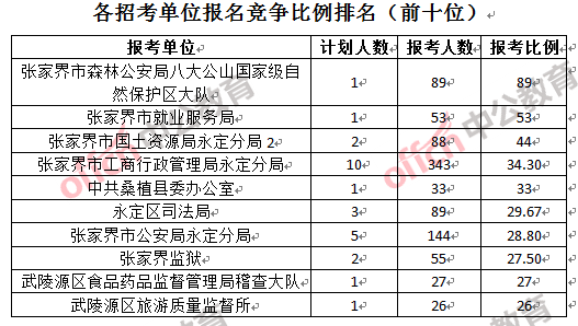 競(jìng)爭(zhēng)熱門招考單位,前三位依次是:張家界市森林公安局八大公山自然保護(hù)區(qū)大隊(duì)(競(jìng)爭(zhēng)比例89:1)、張家界市就業(yè)服務(wù)局(競(jìng)爭(zhēng)比例53:1)和張家界市國(guó)土資源局永定分局(競(jìng)爭(zhēng)比例44:1)。