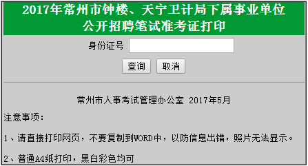 2017江蘇常州市鐘樓、天寧衛(wèi)計局下屬事業(yè)單位招聘筆試準(zhǔn)考證打印入口