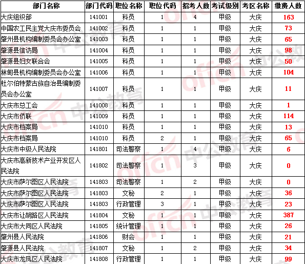 中公網(wǎng)校為參加2014年黑龍江省公務(wù)員考試大慶地區(qū)的考生整理截止至5月19日15點(diǎn)的繳費(fèi)人數(shù),共計(jì)7667人報(bào)考大慶203崗位,大慶地區(qū)最火職位為“讓區(qū)人民法院”報(bào)名比例:1:387。由于報(bào)名網(wǎng)站報(bào)名情況每30分鐘統(tǒng)計(jì)一次,數(shù)據(jù)可能會(huì)有細(xì)微差異,所有數(shù)據(jù)僅供大家參考。(Ps:與最終繳費(fèi)人數(shù)不會(huì)有太大差距)