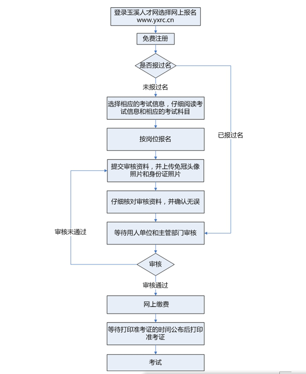 網(wǎng)絡(luò)報名的大致流程為:登錄玉溪人才網(wǎng)→網(wǎng)上報名入口→注冊→查看招聘崗位→按崗位報名并填寫報名資料→等待審核→審核通過→網(wǎng)上交費(fèi)(注意查看交費(fèi)狀態(tài),確認(rèn)交費(fèi))→打印筆試準(zhǔn)考證(打印時間在筆試公告內(nèi)另行通知)→參加筆試。