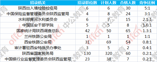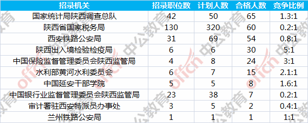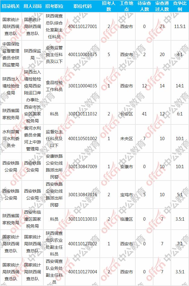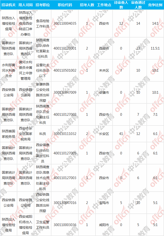 報名通過審核人數前十的職位主要集中在陜西出入境檢驗檢疫局、國家統(tǒng)計局陜西調查總隊、西安鐵路公安局等部門,具體信息如下:
