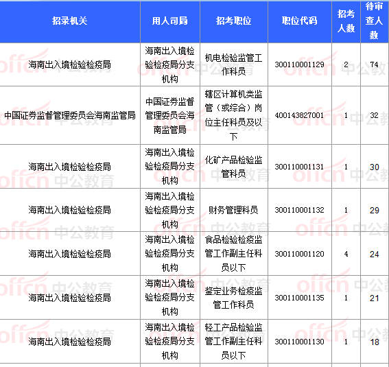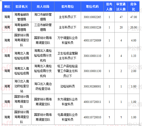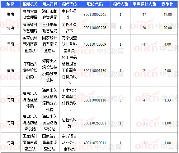 報名通過審核人數(shù)前十的職位主要集中在海南省郵政管理局、國家統(tǒng)計(jì)局海南調(diào)查總隊(duì)、海南出入境檢驗(yàn)檢疫局等部門,具體信息如下: