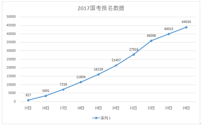 下圖是2017年國考每日報名情況公務員考試報名,應該慎重選擇職位,但也不要拖到最后一天才報名,4號左右報名最為合適,即使審核沒通過,也有重新改報其他職位的時間。