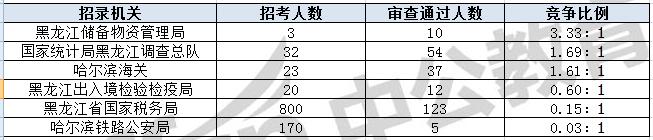 截止到30日18時,通過審核人數(shù)前三位的部門依次是:黑龍江省國家稅務(wù)局、國家統(tǒng)計(jì)局黑龍江調(diào)查總隊(duì)、哈爾濱海關(guān),三部門通過審核總?cè)藬?shù)達(dá)214人,占通過審核總?cè)藬?shù)的88.8%。