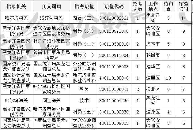 報(bào)名通過審核人數(shù)前十的職位主要集中在黑龍江省國家稅務(wù)局、哈爾濱海關(guān)、國家統(tǒng)計(jì)局黑龍江調(diào)查總隊(duì)等部門,具體信息如下: