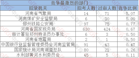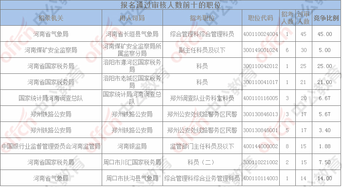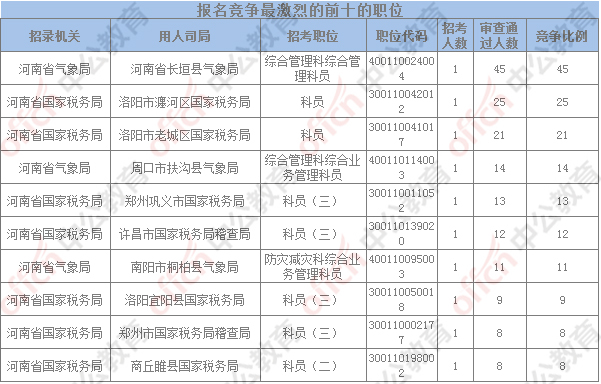 報(bào)名通過(guò)審核人數(shù)前十的職位主要集中在河南省氣象局、河南煤礦安全監(jiān)察局、河南省國(guó)家稅務(wù)局、國(guó)家統(tǒng)計(jì)局河南調(diào)查總隊(duì)等部門(mén),具體信息如下: