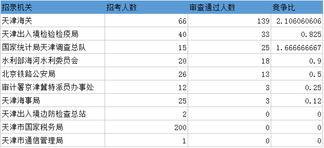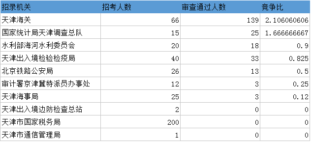 截止到31日9時,通過審核人數(shù)前三位的部門依次是:天津海關(guān)、天津出入境檢驗檢疫局、國家統(tǒng)計局天津調(diào)查總隊,三部門通過審核總?cè)藬?shù)達197人。