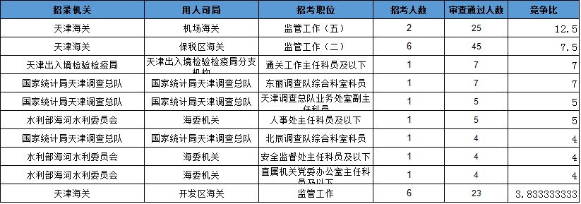 截止到31日9時,競爭比例的職位為天津海關(guān)的監(jiān)管工作(五),招錄1人,截止到31日9時通過人數(shù)為25人。