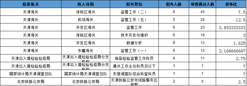 報名通過審核人數(shù)前十的職位主要集中在天津海關(guān)、天津出入境檢驗檢疫局等部門,具體信息如下: