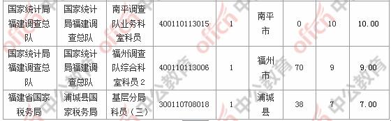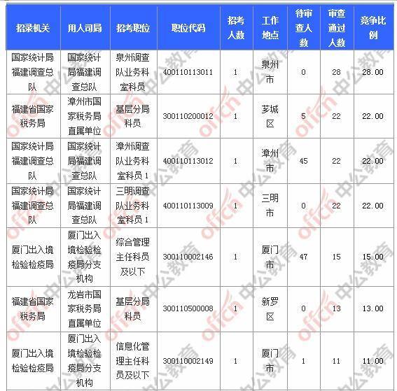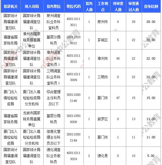 報(bào)名通過審核人數(shù)前十的職位主要集中在國家統(tǒng)計(jì)局福建調(diào)查總隊(duì)、福建省國家稅務(wù)局、廈門出入境檢驗(yàn)檢疫局等部門,具體信息如下: