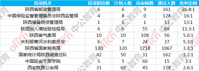 報(bào)名人數(shù)前十的職位主要集中在陜西省國家稅務(wù)局、西安鐵路監(jiān)督管理局、中國保險(xiǎn)監(jiān)督管理委員會陜西監(jiān)管局等部門,具體信息如下: