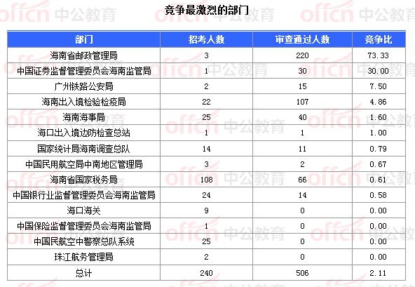 截至10月31日18時,據(jù)中公網(wǎng)校統(tǒng)計,國考職位中工作地點在海南的職位通過審核總?cè)藬?shù)為506人,共有100個職位無人通過審核,其中還有部分待審核的人數(shù)高達860人,平均競爭比例為2.11:1。