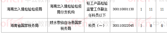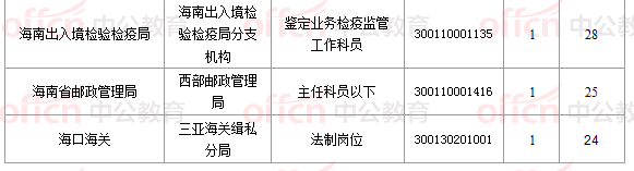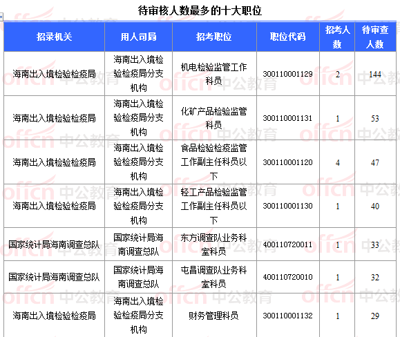 報名通過審核人數(shù)前十的職位主要集中在海南省郵政管理局、中國證券監(jiān)督管理委員會海南監(jiān)管局、海南出入境檢驗檢疫局等部門,具體信息如下: