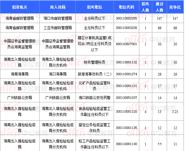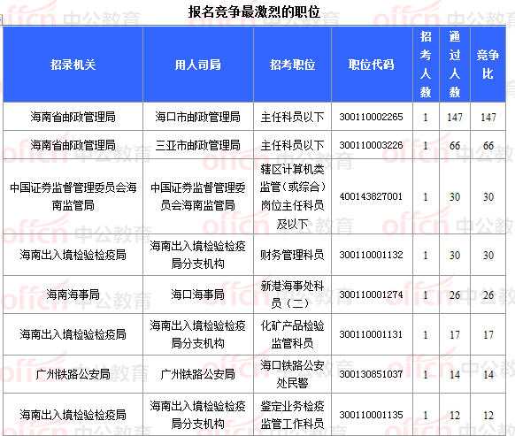 截止到31日18時,競爭比例的職位為海南省郵政管理局??谑朽]政管理局主任科員以下一職,招錄1人,截止到31日18時通過人數(shù)為147人,創(chuàng)歷史新高!