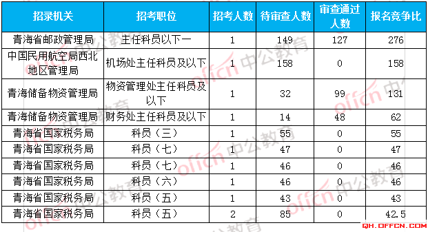 報名人數(shù)前十的職位主要集中在青海省郵政管理局、青海儲備物資管理局、青海省國家稅務(wù)局等部門,具體信息如下: