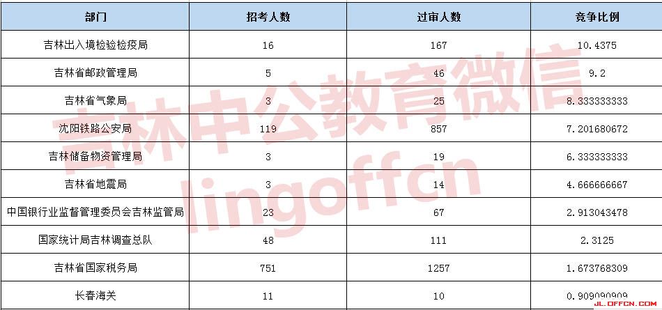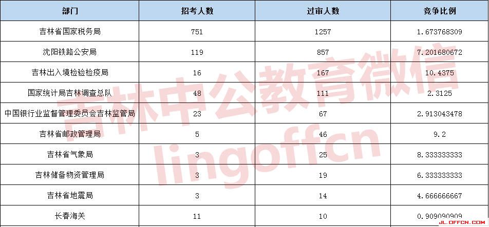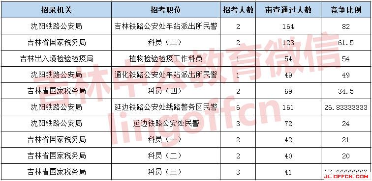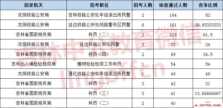 報(bào)名通過審核人數(shù)前十的職位主要集中在沈陽鐵路公安局、吉林國家稅務(wù)局、吉林出入境檢疫檢驗(yàn)局等部門,具體信息如下: