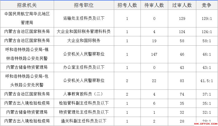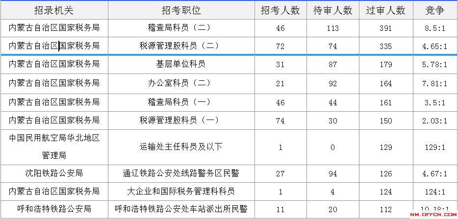 報(bào)名通過(guò)審核人數(shù)前十的職位主要集中在內(nèi)蒙古自治區(qū)國(guó)家稅務(wù)局,沈陽(yáng)鐵路局、呼和浩特鐵路局以及中國(guó)民用航空局華北地區(qū)管理局等部門,具體信息如下: