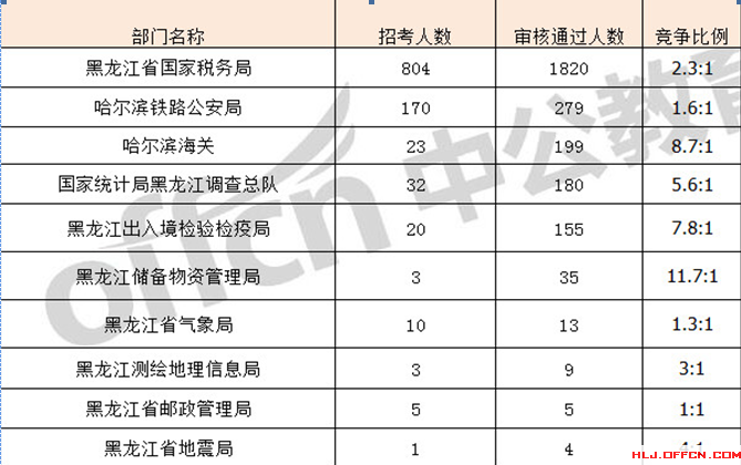 報(bào)名通過審核人數(shù)前十的職位主要集中在黑龍江省國(guó)家稅務(wù)局、國(guó)家統(tǒng)計(jì)局黑龍江調(diào)查、黑龍江出入境檢驗(yàn)檢疫局等部門。