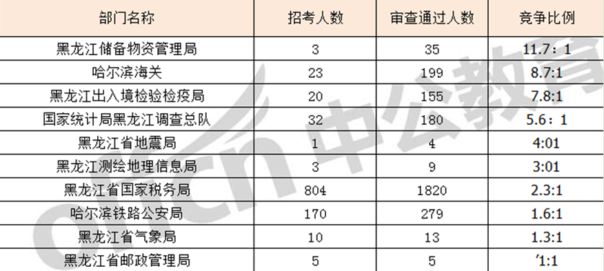 截止到31日18時(shí),競(jìng)爭(zhēng)比例的職位為黑龍江物資儲(chǔ)備管理局、招錄3人,截止到31日18時(shí)通過人數(shù)為35人,其次為哈爾濱海關(guān)、黑龍江出入境檢驗(yàn)檢疫局。
