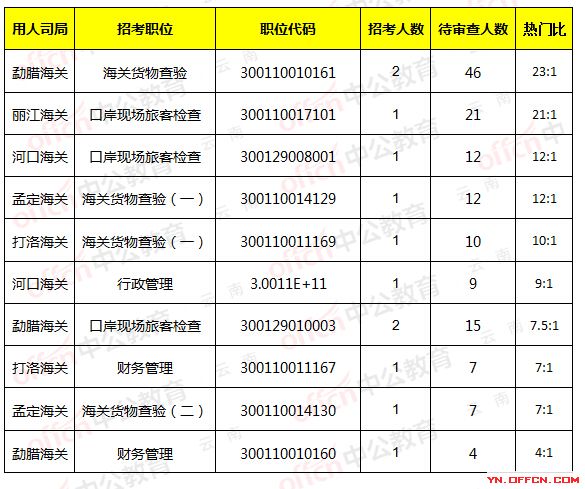 國考報名第二天人數(shù)總待審核的共2380人,海關(guān)占4.8%,當(dāng)前昆明海關(guān)勐臘海關(guān),職位代碼300110010161的崗位相比報名人數(shù)為多,招2人,46人報名待審,6人報名審核通過,熱門比為:23:1