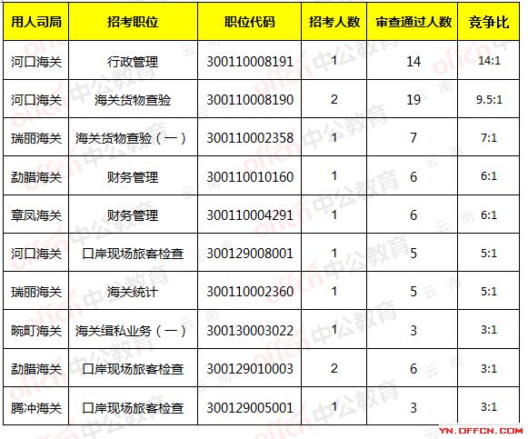 2018國家公務(wù)員海關(guān)報名人數(shù)為319人,115人審核通過。截止31日18時昆明海關(guān)河口海關(guān)的行政管理,職位代碼:300110008191,工作地點河口瑤族自治縣,招錄1人,審查通過人數(shù)為14人,待審核9人,暫時競爭比為14:1,具體信息如下: