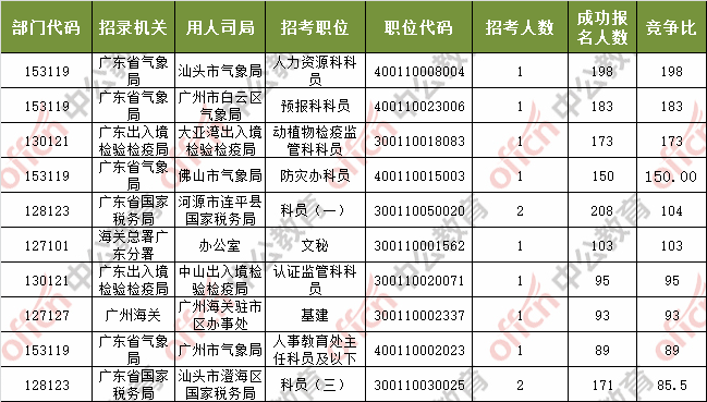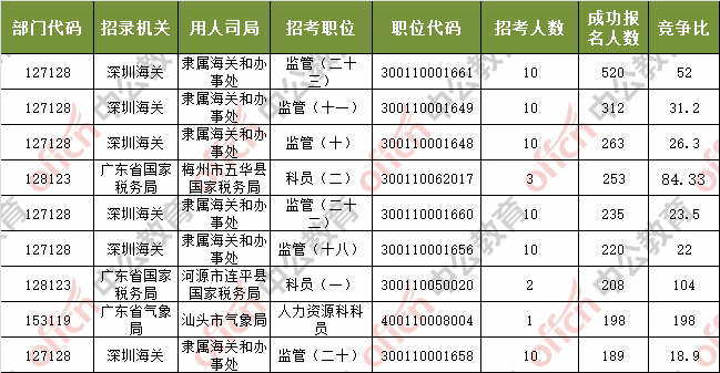 報名通過審核人數(shù)前十的職位主要集中在深圳海關(guān)、廣東省國家稅務(wù)局、廣東省氣象局等部門,具體信息如下: