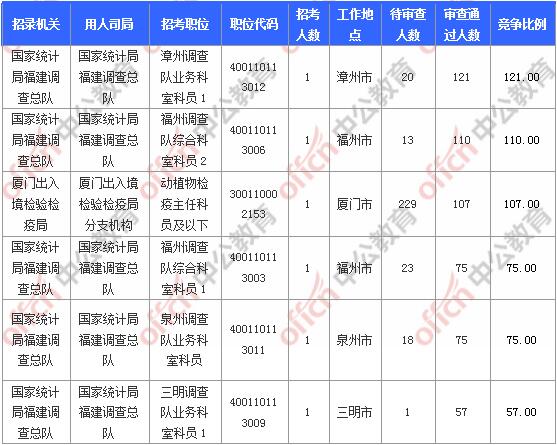 截止到1日16時(shí),競(jìng)爭(zhēng)比例的職位為國(guó)家統(tǒng)計(jì)局福建調(diào)查總隊(duì)漳州調(diào)查隊(duì)業(yè)務(wù)科室科員1400110113012一職,招錄1人,截止到1日16時(shí)通過人數(shù)為121人,競(jìng)爭(zhēng)比例121:1!