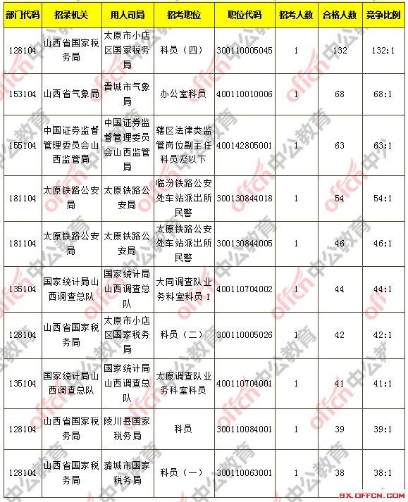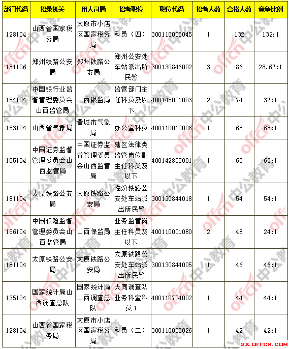 報(bào)名通過審核人數(shù)前十的職位主要集中在山西省國家稅務(wù)局、鄭州鐵路公安局、中國銀行業(yè)監(jiān)督管理委員會(huì)山西監(jiān)管局等部門,具體信息如下: