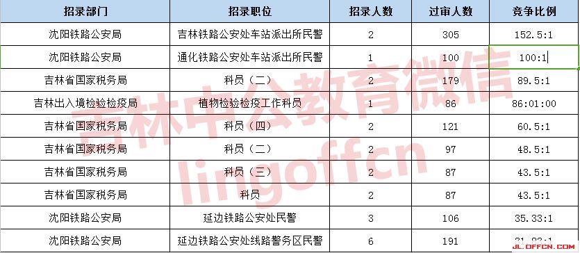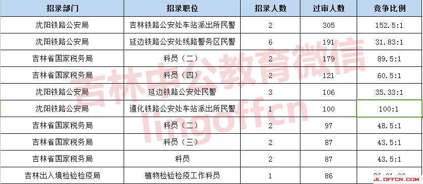報(bào)名通過審核人數(shù)前十的職位主要集中在沈陽鐵路公安局、吉林國家稅務(wù)局、吉林出入境檢疫檢驗(yàn)局等部門,具體信息如下: