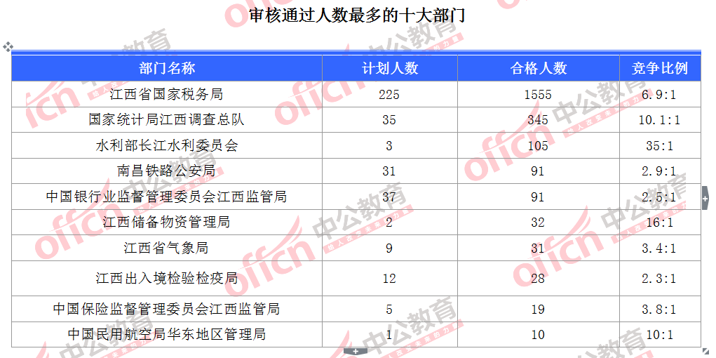 截止到1日17時,通過審核人數(shù)前三位的部門依次是:江西省國家稅務(wù)局、國家統(tǒng)計局江西調(diào)查總隊、水利部長江水利委員會,三部門通過審核總?cè)藬?shù)達2005人,占通過審核總?cè)藬?shù)的86.3%。
